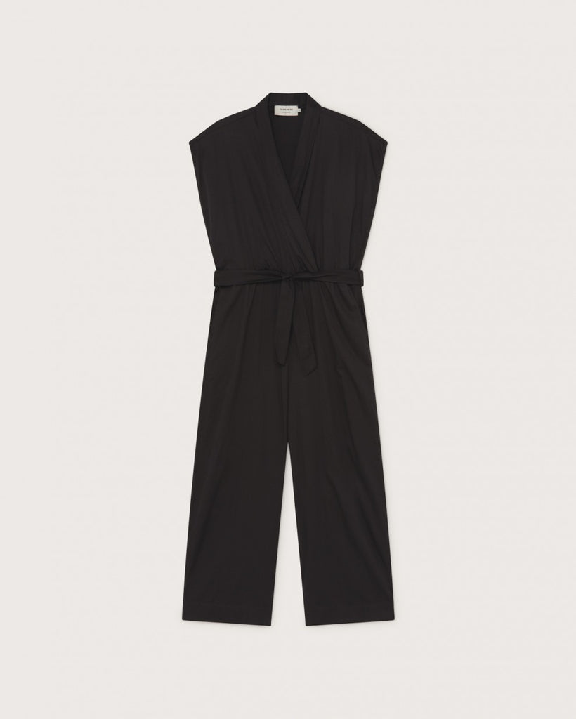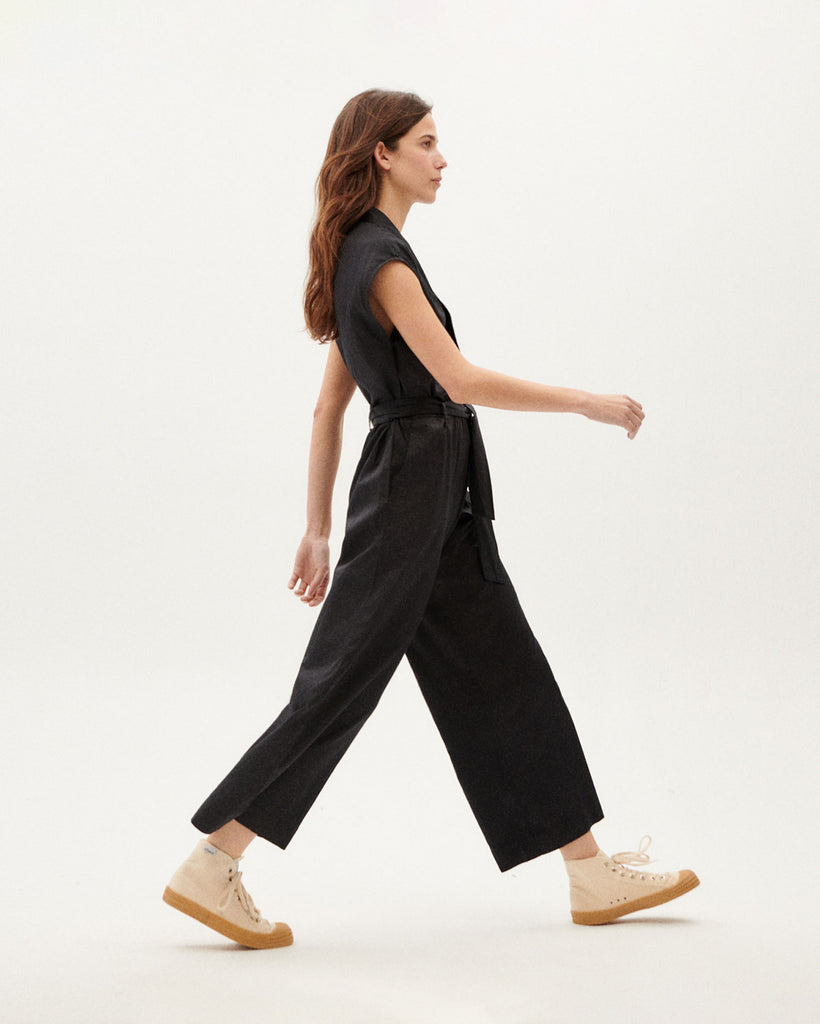 Jumpsuit aus leichter Bio-Baumwolle mit Bindegürtel in der Taille und Schalkargen vom spanischen Fairfashion Label THINKING MU. Sommerlich leicht und dennoch angezogen ist der Jumpsuit ein stylischer Begleiter für viele Gelegenheiten.