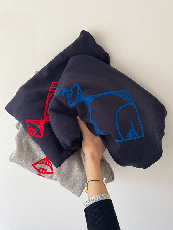 Organic Sweatshirt mit Print (Flock-Druck) von TIIEM. Das Sweatshirt hat einen Rundhalsausschnitt und überschnittene Schultern. Loose Fit.