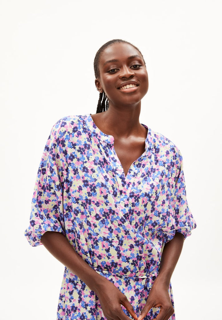 Kleid mit Alloverprint von ARMEDANGELS. Das Kleid hat einen kleinen Stehkragen, 3/4-Ärmel, einen Taillengürtel und seitliche Eingriffstaschen. Oversized.